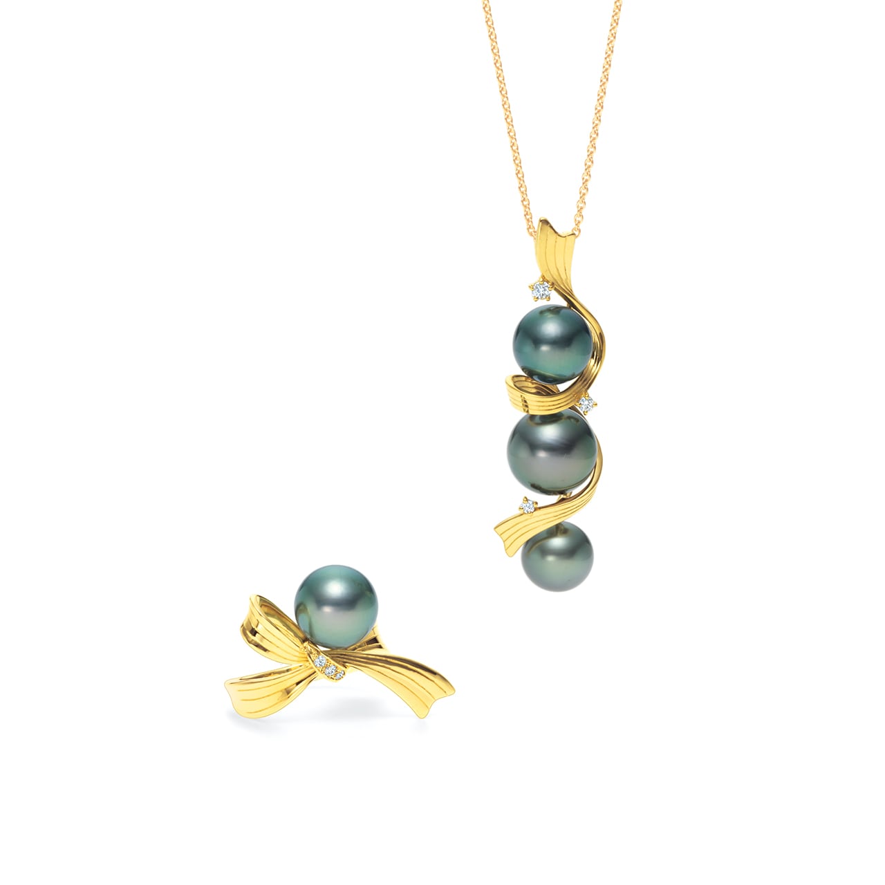 深みのあるトーンの黒蝶パールにストライプ模様を施したリボンが絡み合う、大人の品格と個性を兼ね備えたパールジュエリー。