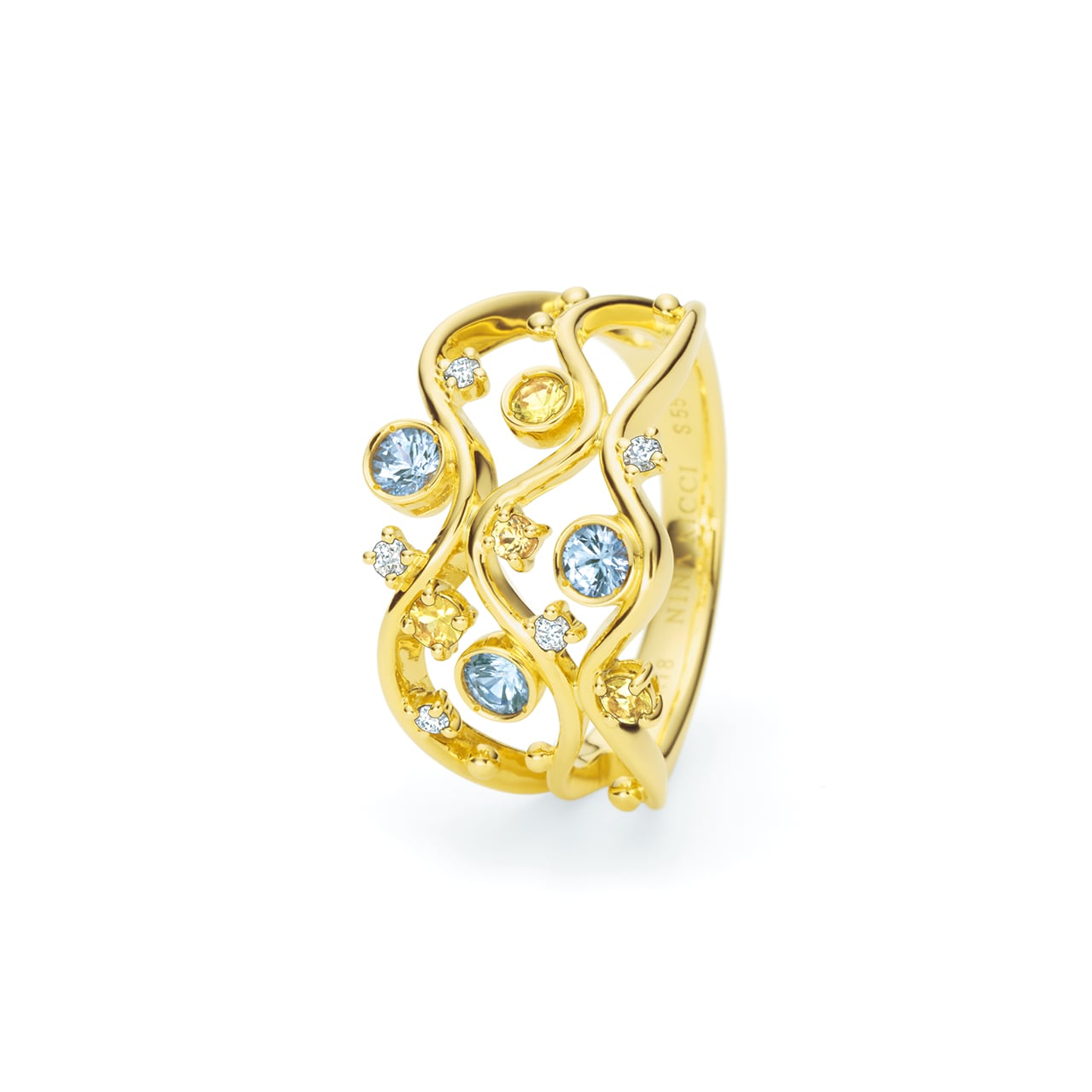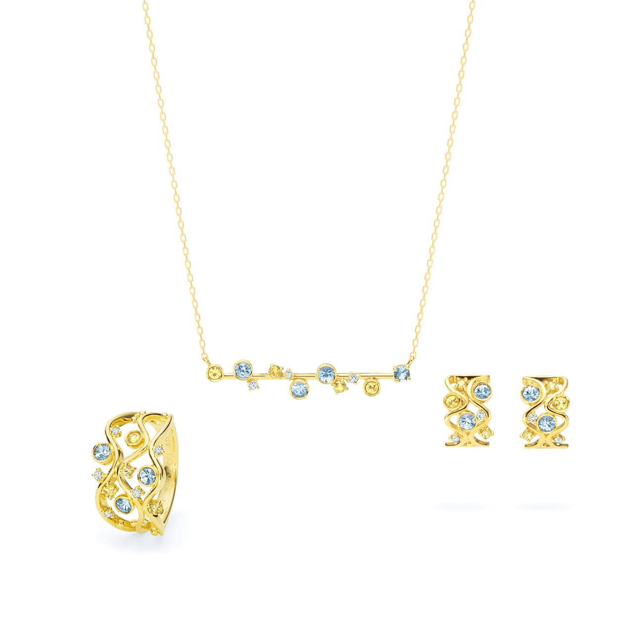 ラウンドのカラーサファイアが、きらめくリズムで散りばめられたドットデザイン。