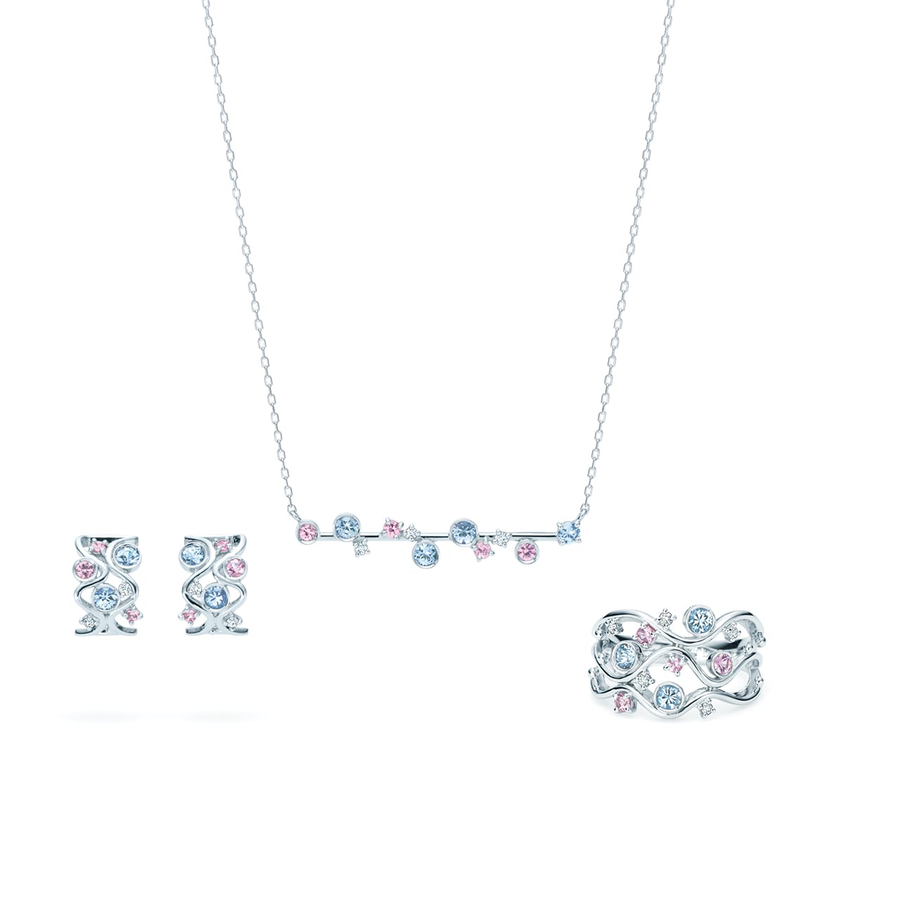 ラウンドのカラーサファイアが、きらめくリズムで散りばめられたドットデザイン。